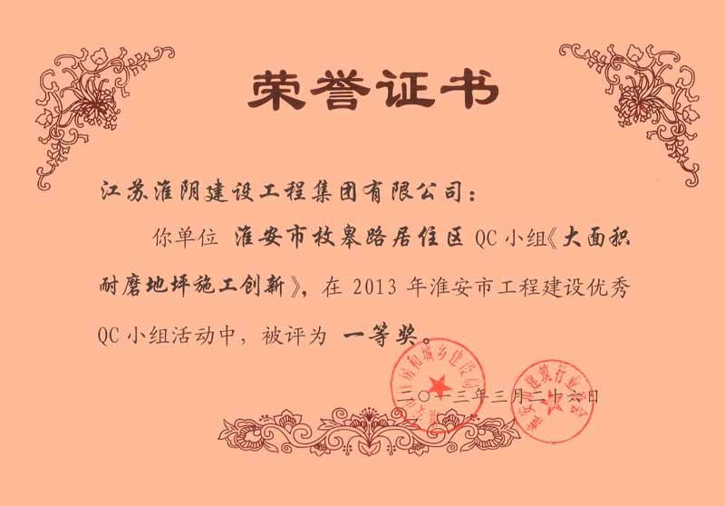 2013年市工程建设优秀QC一等奖 枚皋路居住区-大面积耐磨地坪施工创新(戴威)
