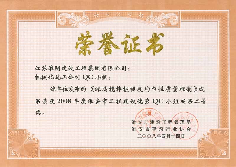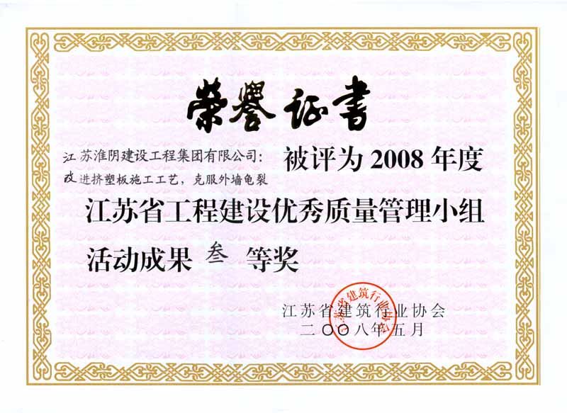 2008年省工程建设优秀质量管理小组活动成果优秀奖-确保5
